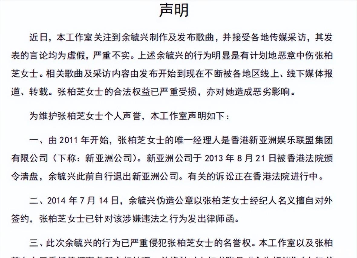 张柏芝和前经纪人余毓兴最近打了一场官司。余毓兴起诉称,张柏芝2011年签了八年经纪人合同,他提前给了她4000万片酬,但张没拍完约定电影还私下接活。余要求她赔偿1276万并公开2015到2019年的收入。张柏芝否认签过这份合同,并指余毓兴伪造文件。两人说法差异大。余毓兴自称是张柏芝“干爹”,称她为买豪宅主动求合作,结果没履行承诺。张柏芝则说不认识余毓兴父亲,合同是助理谈的,且公司早清盘。她还控诉余毓兴谎称患癌骗她信任,私下压低她节目酬劳从1500万报成700万。